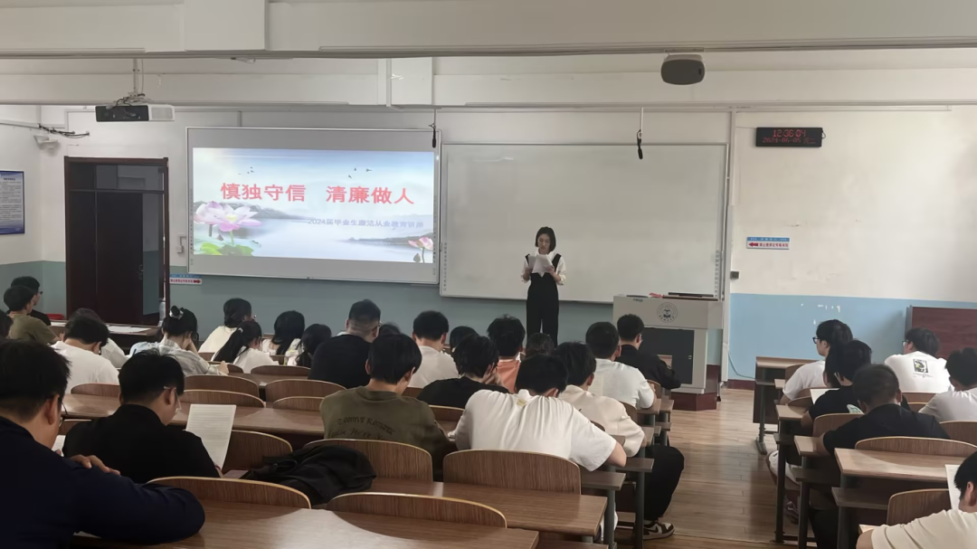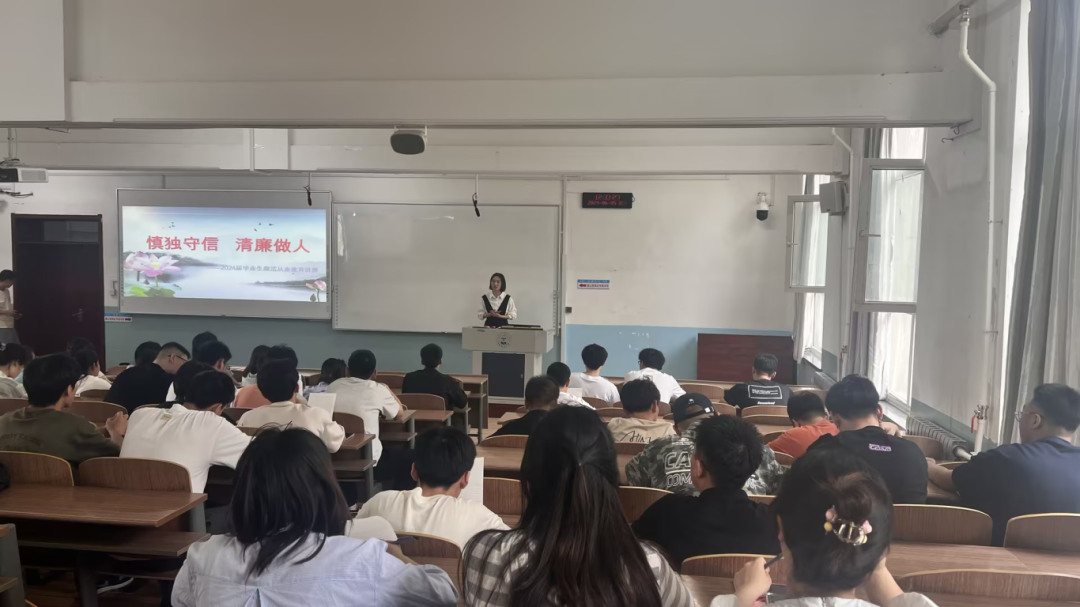 为筑牢毕业生崇廉尚洁的思想根基,引导学生树立正确的廉洁观,提高廉洁从业意识,扣好职业生涯的“第一粒扣子”,在学习和工作的各个领域中,发挥好先锋模范作用。2024年6月5日中午12点,机电工程学院于一教309开展“‘慎独守信 清廉做人’——上好毕业生离校‘重要一课’”专题教育活动,本次会议由王丽贺老师主持,2024届毕业生参加。