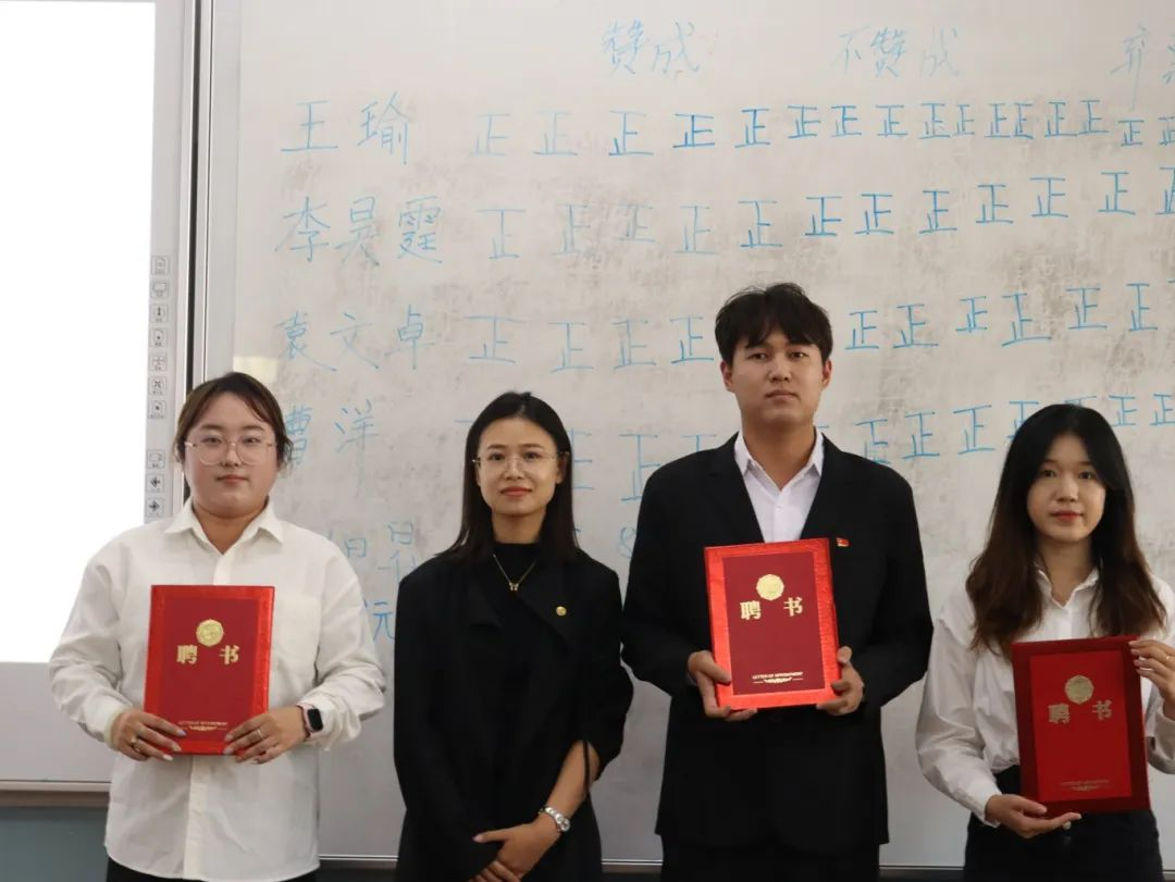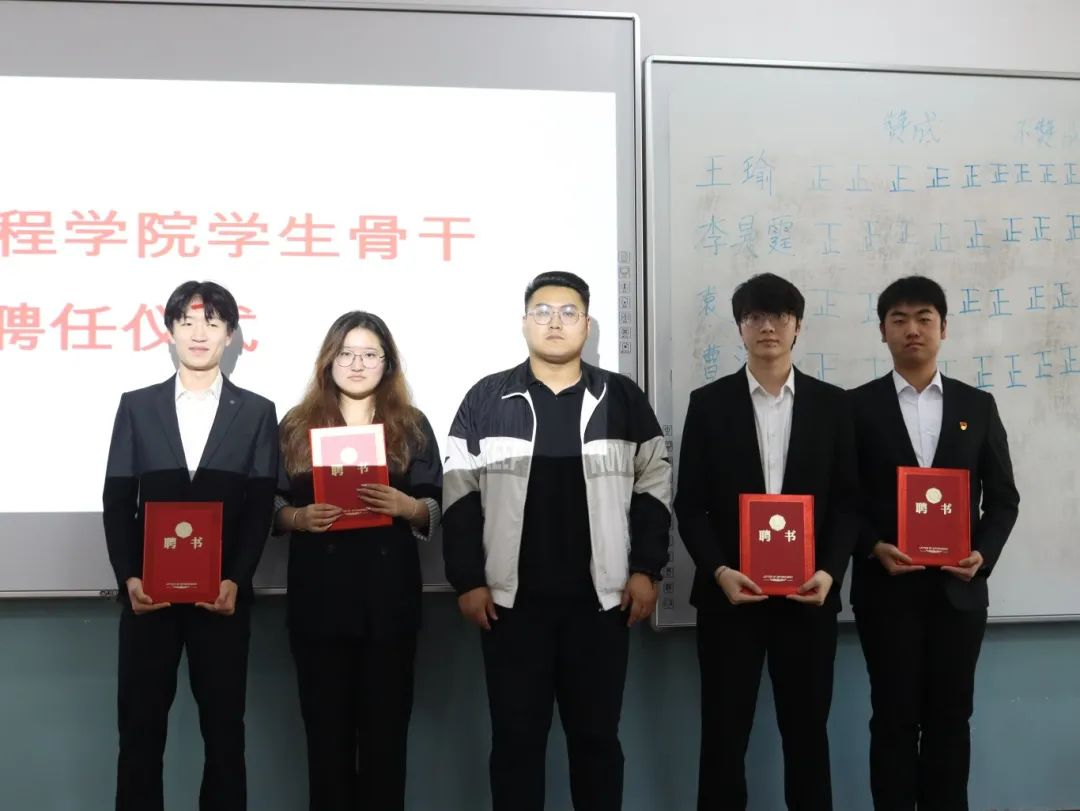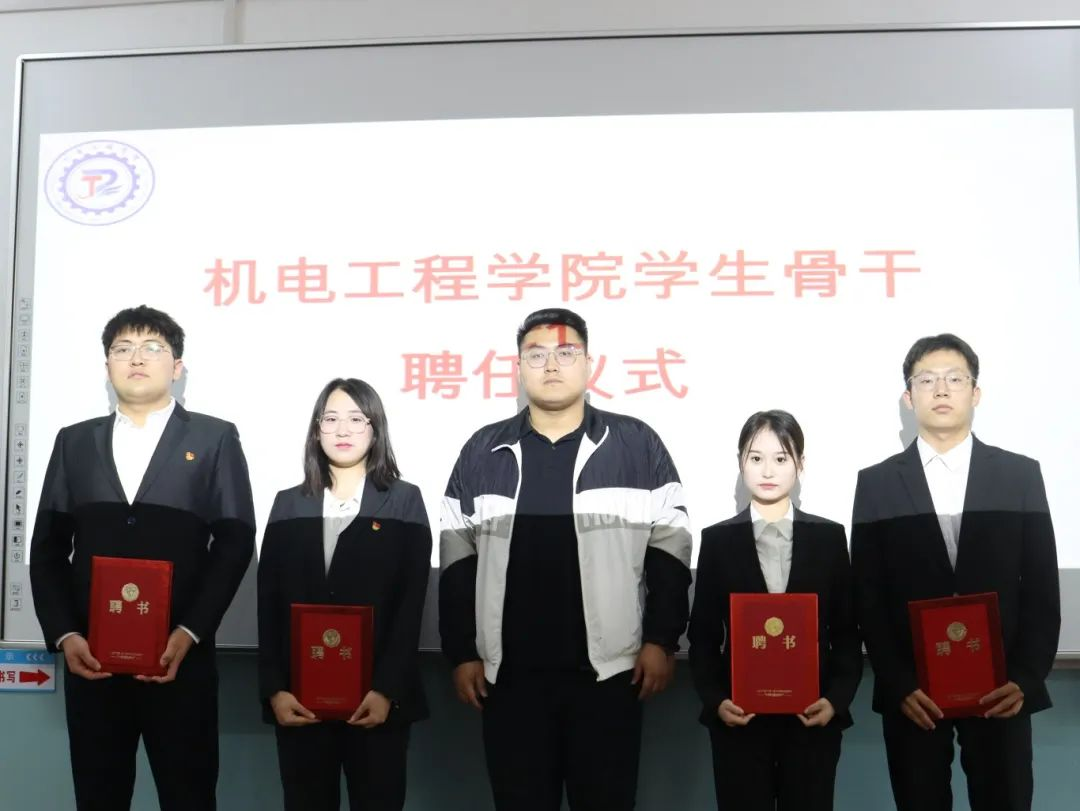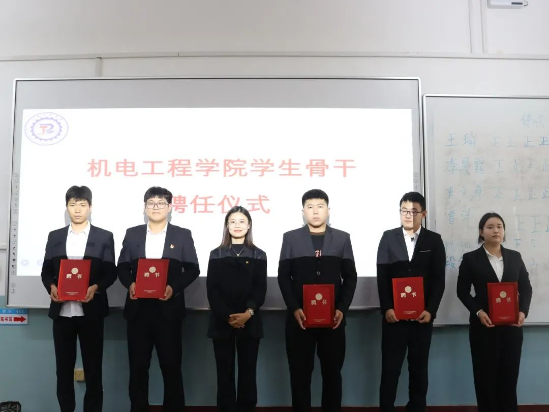 机电工程学院团委书记王梓漠老师、21级辅导员王清蔚老师为2023-2024届学生干部颁发聘任书,并合影留念。