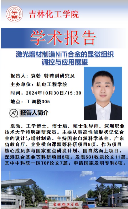 为推动我院科研水平发展,拓宽科技领域,促进校际间的学术交流与合作,及提升研究生学术水平,2024年10月30日,我院特邀请深圳职业技术大学特聘副研究员袁勃为机电工程学院教师、硕士研究生做题为《激光增材制造NiTi合金的显微组织调控与应用展望》的学术报告。袁勃,工学博士,博士后,硕士生导师,深圳职业技术大学特聘副研究员。主要从事高性能形状记忆合金的设计与增材制造。主持国家自然科学基金、广东省教育厅、企业横向课题等科研项目8项。作为项目核心成员参与国家重点研发计划、国自然面上项目、深港联合基金等科研项目8项。参与筹建“北京三帝科技股份有限公司与深圳职业技术大学共建联合实验室”、“深职大-三帝科技”增材制造技术校企联合研发中心。发表SCI收录论文11篇,其中中科院一区TOP论文7篇;申请国家发明专利6项。
