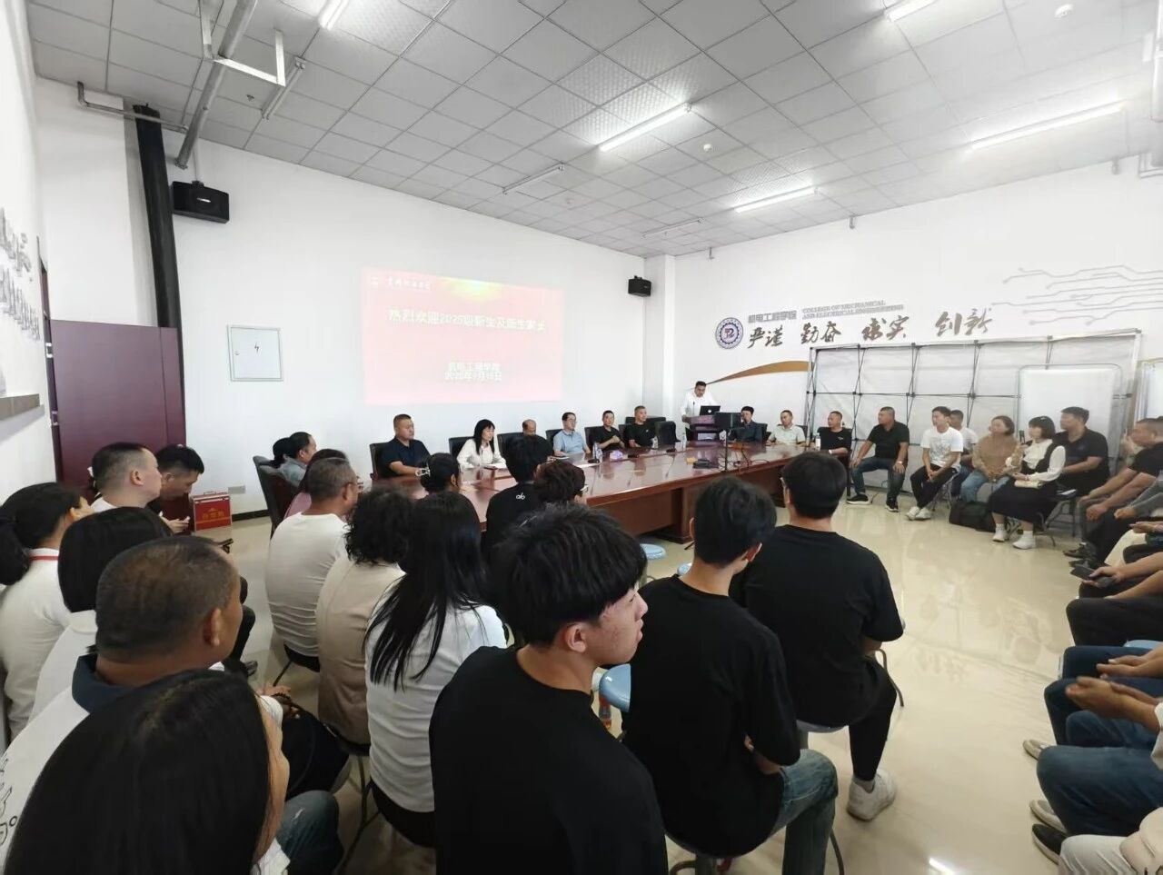 为深入贯彻协同育人理念,增进家长对校园环境与教育模式的了解,助力新生尽快融入大学生活,2025年9月15日中午,机电工程学院于工训大楼305召开2025级新生家长见面会。本次见面会由机电工程学院党委书记杨帆,院长索忠源,党委副书记陈晓磊,副院长王海波,副院长关会英,副院长丁云飞及各系主任莅临指导,2025级本科新生家长参加会议。会议由2025级辅导员王清蔚主持。